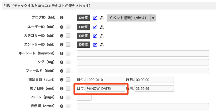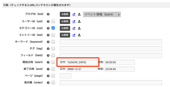 Entry_Summary のモジュールIDの条件設定で、開始日時の日付に %{NOW_DATE} を指定します。 終了日時は長期間の未来を想定し、9999-12-31 と設定しておきます。